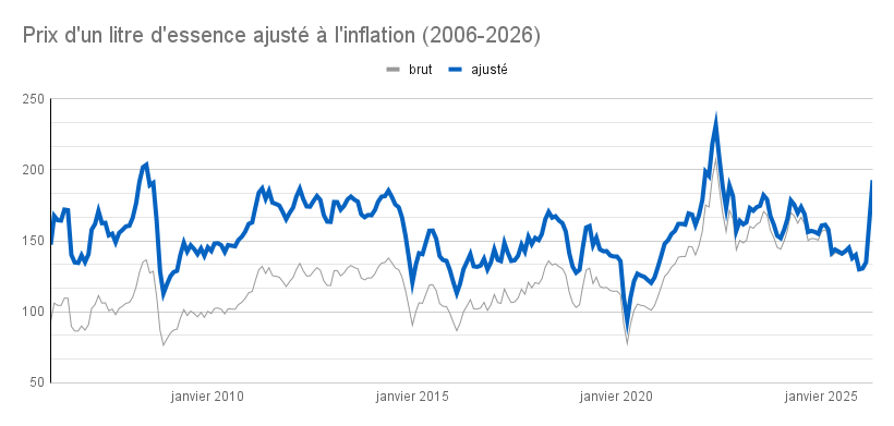 Une perspective historique, ajustée pour l’inflation montre que le prix à la pompe est élevé, mais pas sans précédent. Les étés 2008 et 2022 ont vu le coût moyen au Canada dépasser les 2$ par litre, en dollars constants de 2026, sans toutefois mener à la suspension de la taxe sur les carburants.