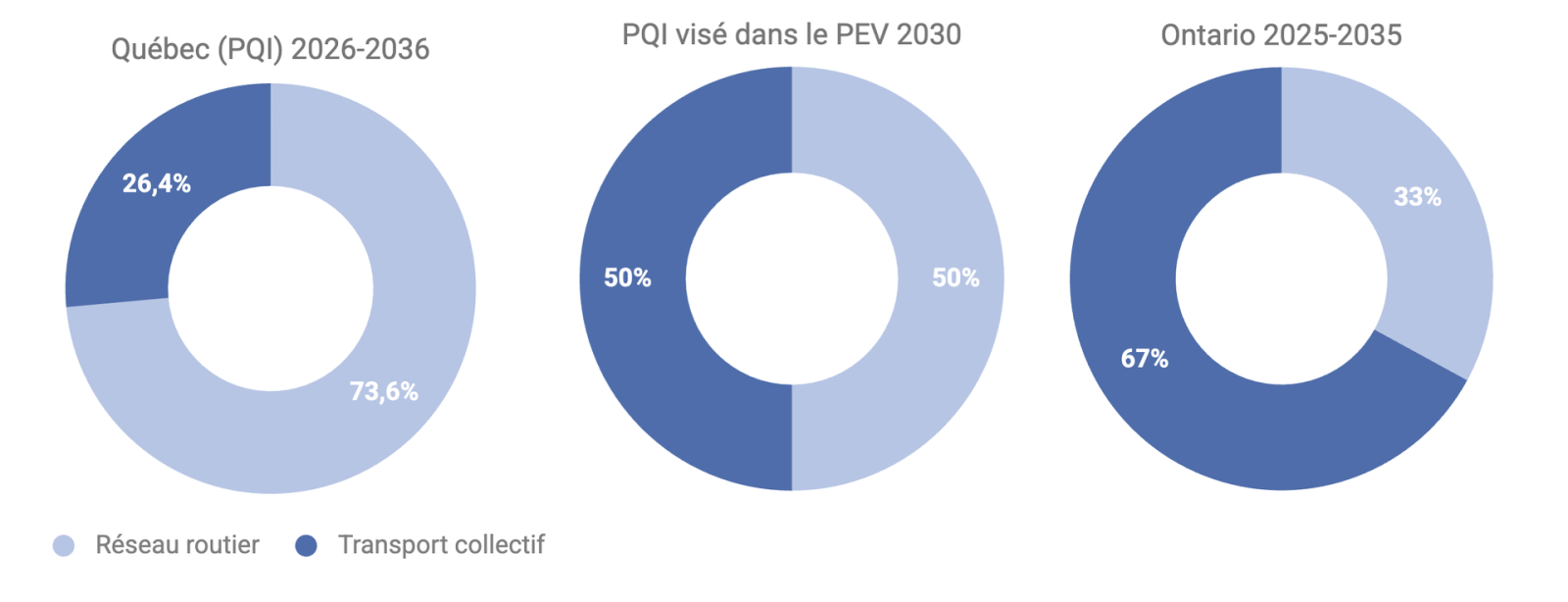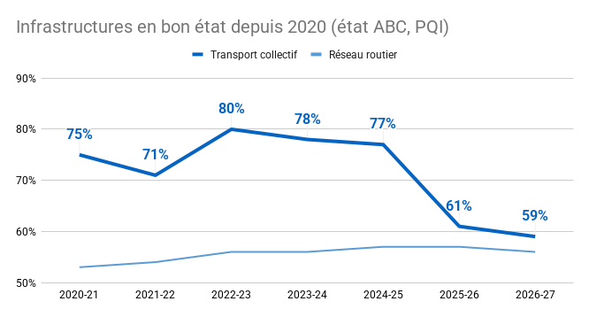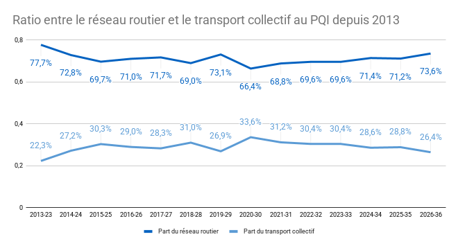 Le budget 2026 s'éloigne de l’objectif d’équilibrer les investissements entre le transport collectif et le réseau routier, pour atteindre son pire ratio depuis 2014, avec 73,6% des investissements en transport réservés au réseau routier.