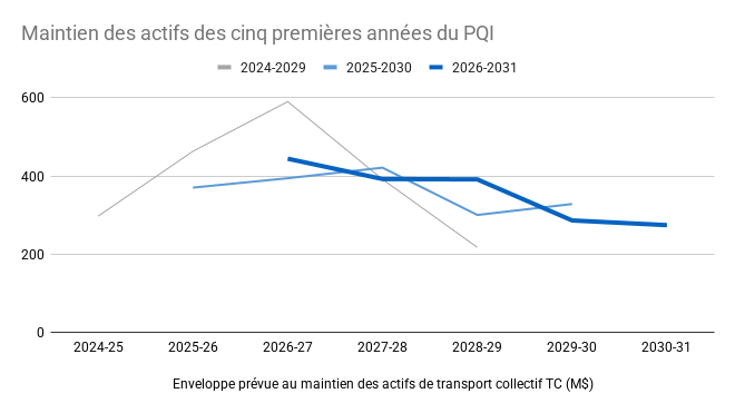 Pire encore, la bonification de l’enveloppe au maintien des actifs dissimule une enveloppe réduite pour les cinq prochaines années. Le gouvernement avait utilisé le même subterfuge au budget de l’an dernier. Si le montant est passé de 2,4 G$, à 3,0, puis 3,5 G$, la part des cinq premières années est passée de 1958 M$ à 1812 M$, puis à 1787 M$. Le bon état des infrastructures sera donc le problème du prochain gouvernement.