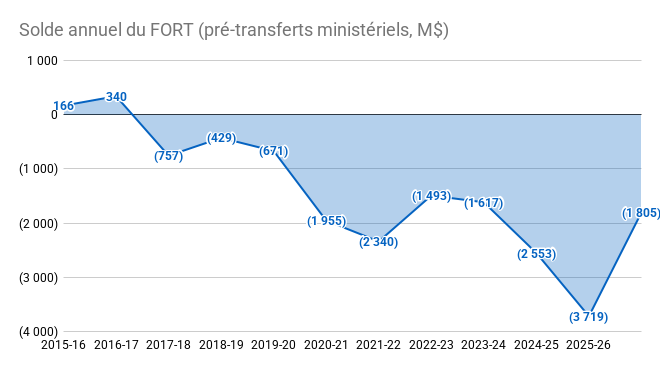 - Déficit du fonds responsable du réseau routier et du transport collectif (FORT) record de 3,7 milliards en 2025-26.*